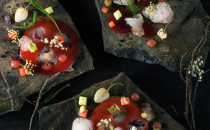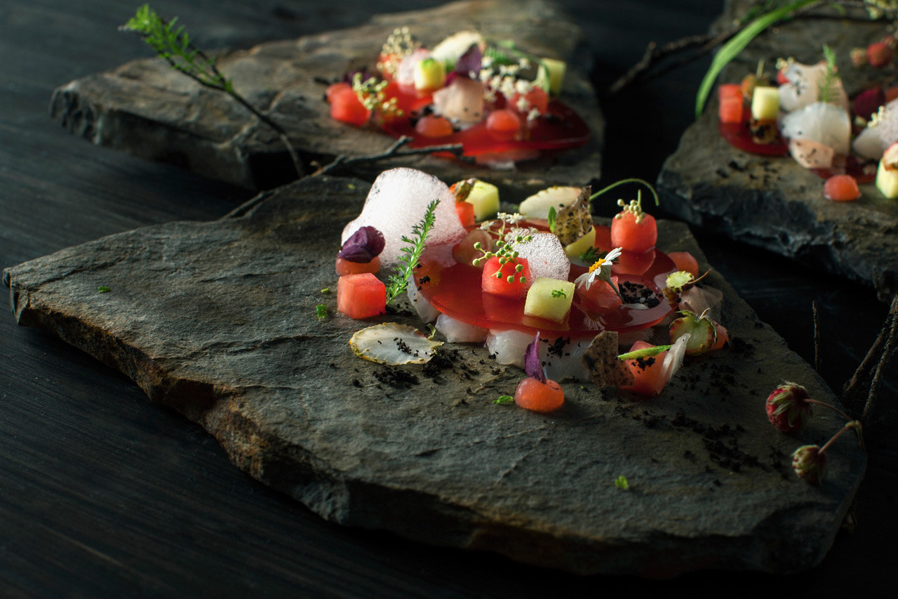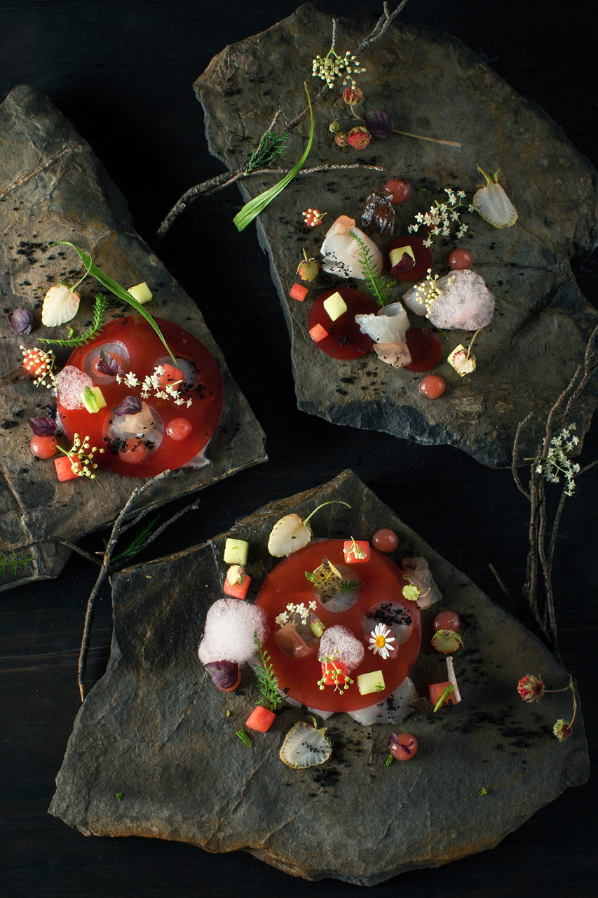 Inspirace přírodou je filozofie, která malými krůčky proniká i do našich končin. Jedním z jejích prvních průkopníků je i Přemek Forejt, který nepotřebuje dlouhé představování, protože jeho práci už delší dobu monitorujeme. Dnes patří do našeho redakčního týmu a tentokrát si pro vás připravil jídlo inspirované přírodou. Sám o tom říká: „Vzniklo, když jsem vzal Jiřího Dittricha a své kamarády kuchaře na výlet, kde jsme hledali ploché kameny, které jsem chtěl použít jako talíře. Po cestě jsme našli spoustu jedlých květů a plodů, např. lesní jahody nebo bez. A v horkém počasí, které zrovna bylo, mě napadl studený ceviche, který se do něj skvěle hodí.“