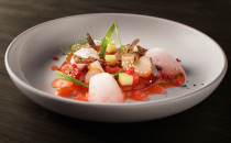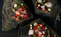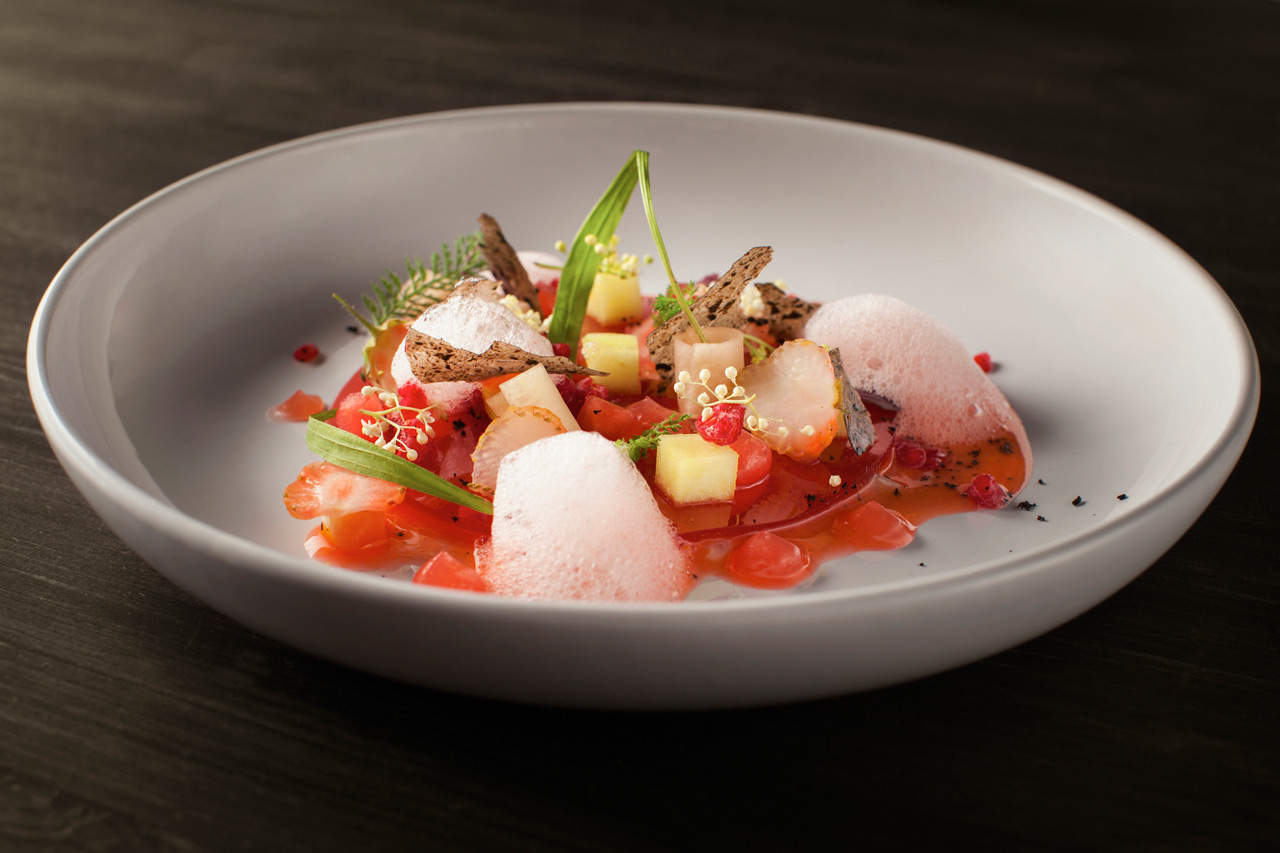 Ceviche z pražmy, vodní meloun, zelené jahody, bezový květ