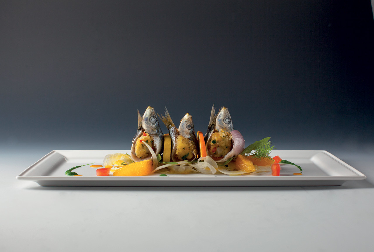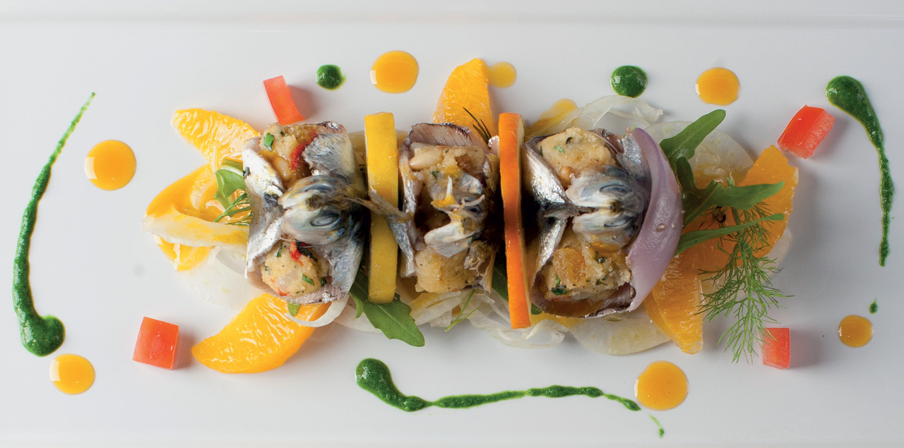 Sardinky beccafi co s rozinkami, piniovými oříšky a sýrem caciocavallo, salát z červených pomerančů a fenyklu : Sebastiano Spriveri